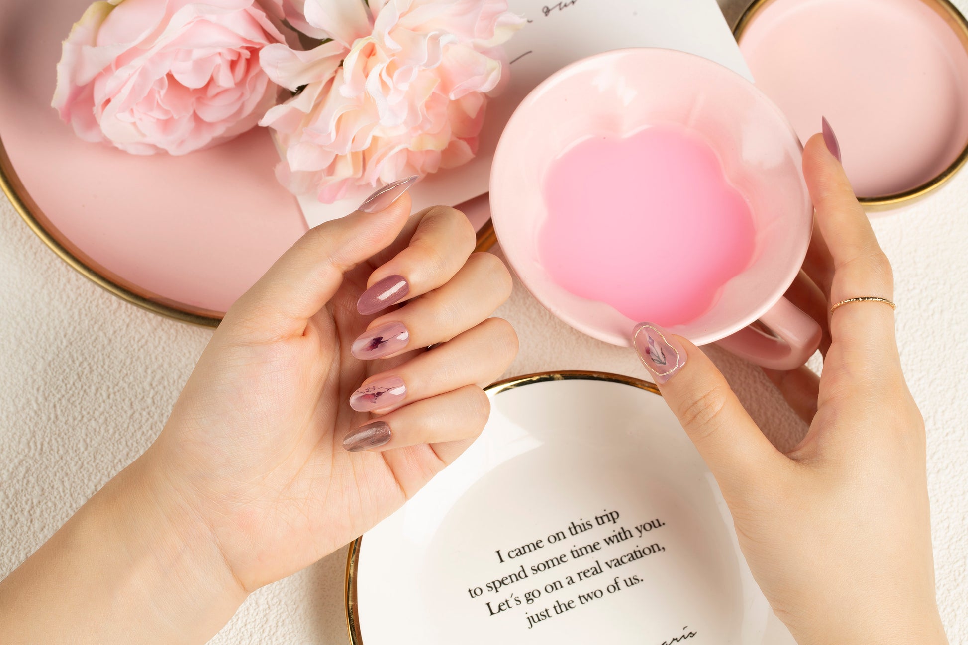 A milky sheer manicure topped with tiny tulips in a short round shape. With golden frame on thumb makes it even more elegant. :)